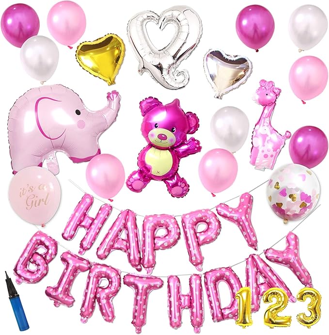 誕生日 バルーン 飾り付け 25点 セット 動物 ハート 風船 女の子 男の子 バースデー 1歳 2歳 3歳 (ピンク)…