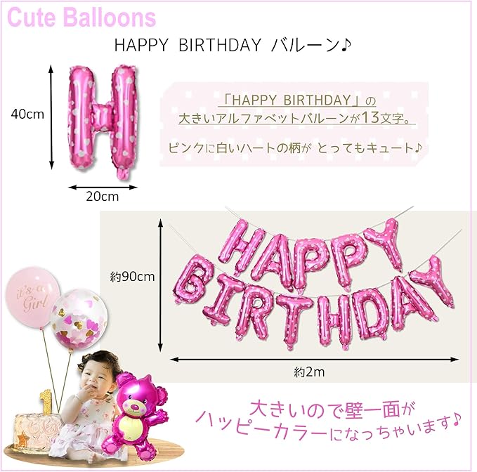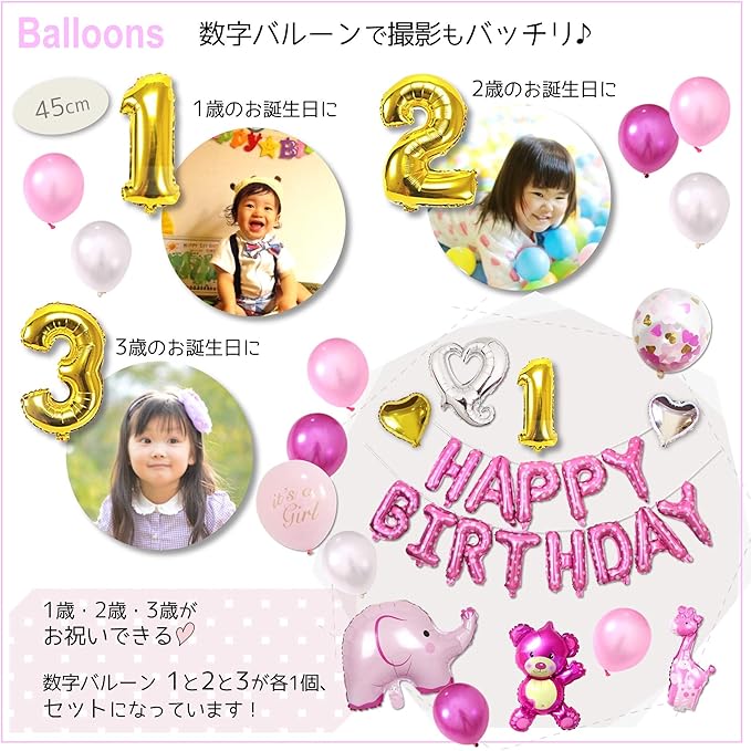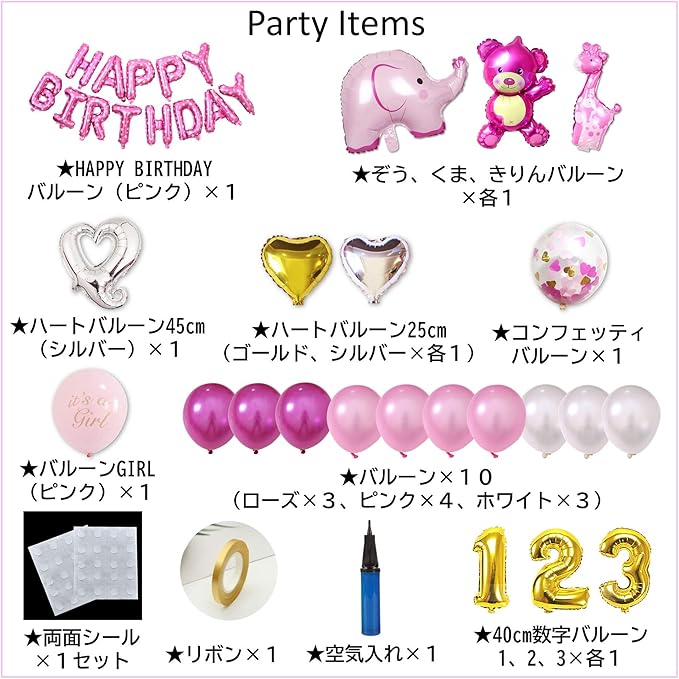 【セット内容】HAPPY BIRTHDAYバルーン 1、動物バルーン(ぞう、くま、きりん 各1)、ハートバルーン45cm 1、ハートバルーン25cm 2、コンフェッティバルーン 1、バルーンGIRL 1、バルーン 10(3色)、リボン 1、空気入れ 1、両面シール 1、数字バルーン『1』『2』『3』 各1 ※サイズ等詳細につきましては商品の説明をご覧ください。