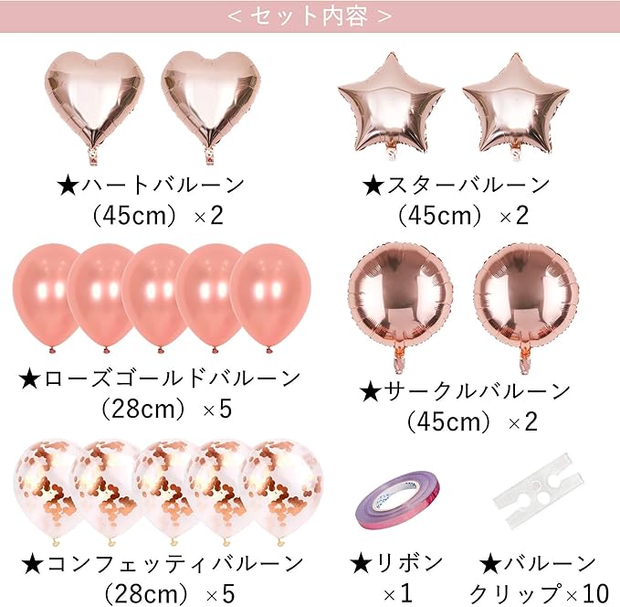 【Cタイプ:セット内容】Happy Birthdayガーランド 1、ハートガーランド 1、ハートコンフェッティバルーン 2、ハートバルーン 2、スターバルーン 2、サークルバルーン 2、ローズゴールドバルーン 5、コンフェッティバルーン 5、リボン 1、バルーンクリップ 10、バルーンスタンド 2、空気入れ 1 ※サイズ等詳細につきましては商品の説明をご覧ください。