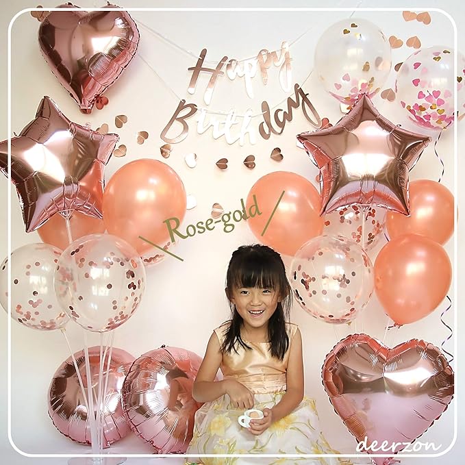 【人気のローズゴールド・バルーンセット】女の子に人気のローズゴールドでコーディネートされた、華やかでかわいいカラーのバルーンセットです。Happy Birthdayのガーランドや、便利な空気入れなども入っておりますので、このセットだけでお誕生日の飾り付けが完成できます。