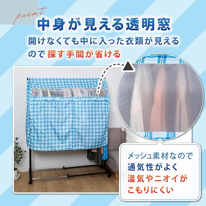 【洗濯機で洗えて衛生的・メッシュ窓】:汚れても洗濯機で洗えるので衛生的。メッシュ窓付きで中の衣類が見える。
