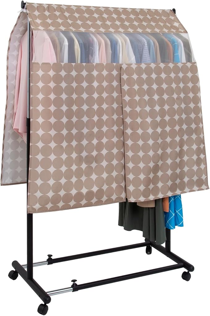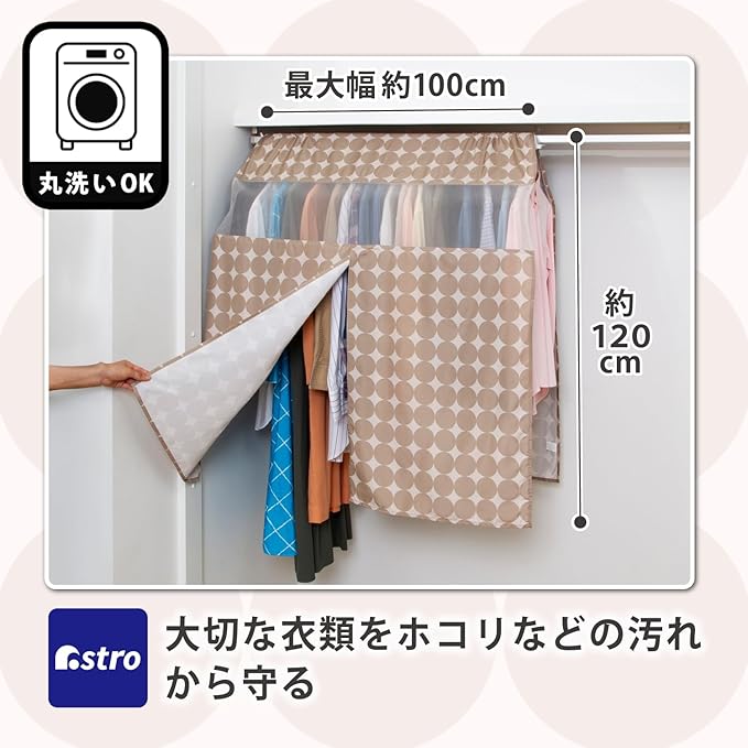アストロ ハンガーラックカバー ブラウン サークル柄 ポリエステル 洗える ウォッシャブル 衣類カバー 洋服カバー 埃除け センタースリット 洋服が見えるメッシュ窓 ずり落ち防止 固定用ひも付き 防塵 クローゼット 吊り下げ 611-07