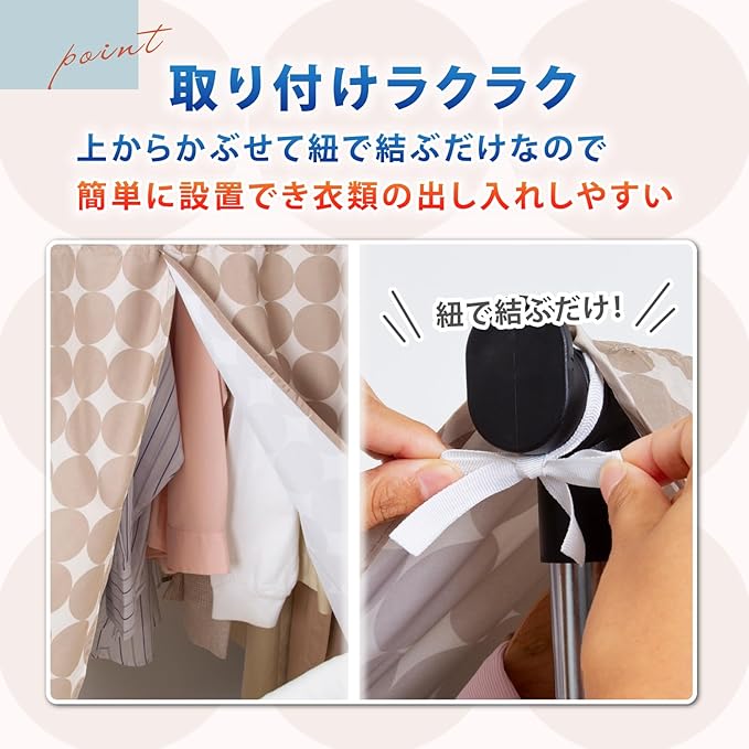 ●両サイドのひもで簡単にハンガーラックに固定でき、ずり落ちる心配いらず。