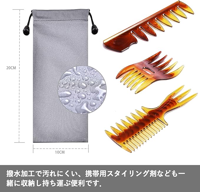 Tumosando メンズ くし コーム 粗め コーム メンズ 3点セット セット用 くし メンズ こはくいろ 防水ポーチ付 スタイリングコーム 櫛 静電気防止 メンズ くし セット