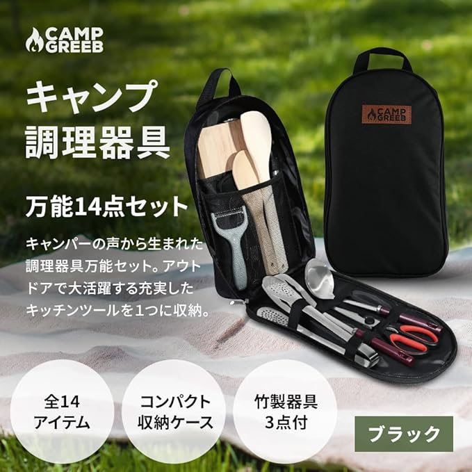 キャンプグリーブ 調理器具 セット 14点 キャンプ アウトドア クッキングツールセット キッチンツール (黒)