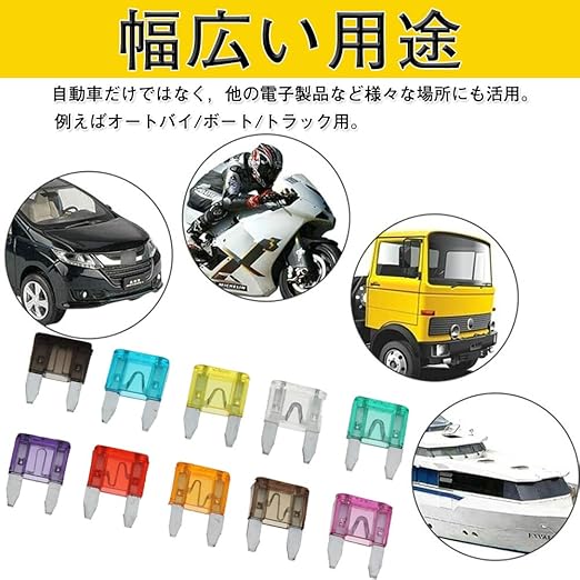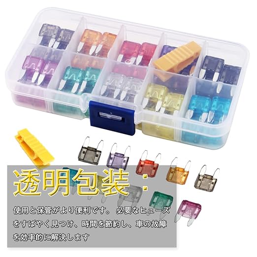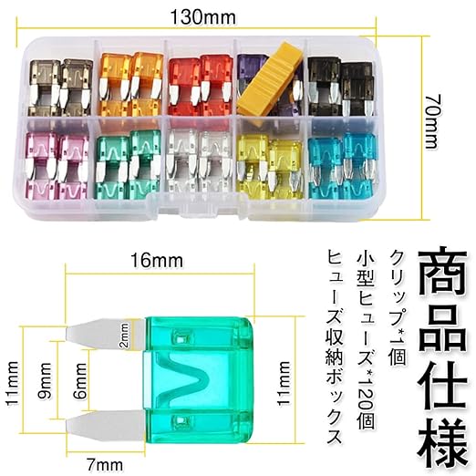 【商品仕様】小型ヒューズ*120個;モデル:2A/3A/5A/7.5A/10A/15A/20A/25A/30A/35A (各12個);材質:亜鉛リングフレーク;ヒューズ収納ボックス;クリップ1個