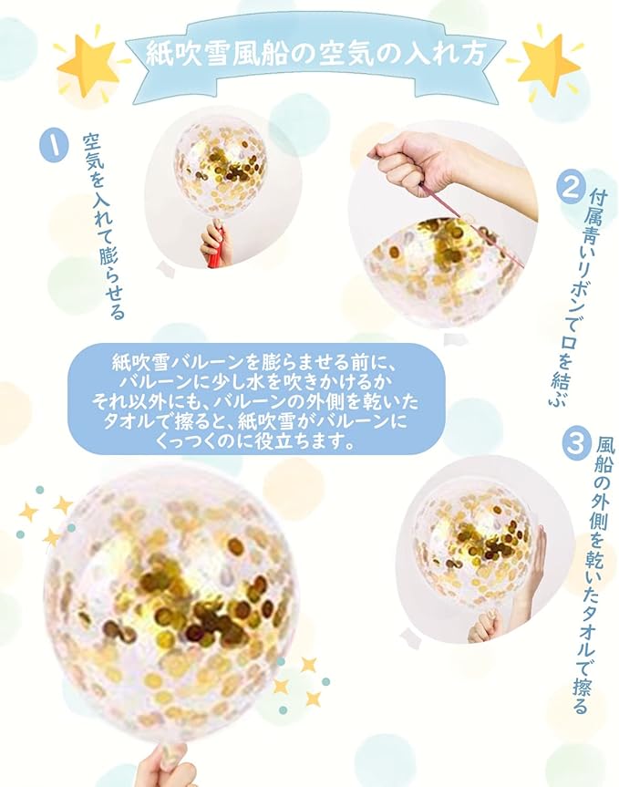 ご注意事項:本製品は装飾品となっております. 6歳未満のお子様が口にしないよう細心の注意をお願い致します. 風船に空気を入れる際は、破れないように少しずつ空気を入れてください. 特に、アルミ風船は空気を入れすぎると破裂してしまうこともあります. 指で押して、少し凹むくらいがベストです. 入荷時期により多少形や色合いが異なる場合がございますのでご了承ください. 結びリボンと壁貼り両面シールは混じて使ってください. 部屋にバルーンを貼る場所がない場合はリボンで室内の壁や窓、または庭に掛けることができます. とても便利です. 誕生日の後、 壁にダメージを与えますので、できる限りリボンを使用することをお勧め致します. リボンは長くて操作も簡単です