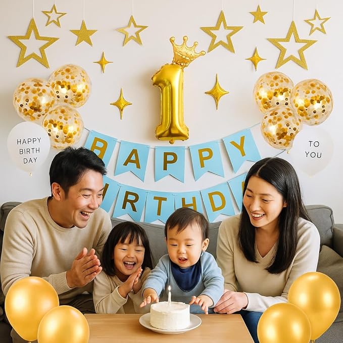 誕生日 飾り付け 1歳 男の子 ブルー ガーランドバルーン 風船 セット バースデー 飾り 王冠 HAPPY BIRTHDAY お洒落 かわいい 女の子 男の子 かざりつけ ゴールデン 一歳 (ゴールド &ブルー)