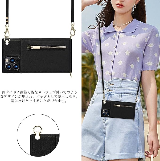 こだわりのデザイン:両サイドに調節可能なストラップ付いてのようなデザインが施され、バッグとして使用したり、肩に掛けたりすることができます。肩から下げてスマホを落とす心配なし、紛失防止にも役に立ちます。ケースを斜めにかけると、お客様の一番快適な長さを自由に調節できるだけでなく、スマホを片手操作することもできます。ケースの背面にはハート型のジッパー付きポケットがあり、可愛くて綺麗に見えます。マグネット式の縦型開口財布型デザインの ケースは、シンプルで便利なだけでなく、コンパクトで美しいです