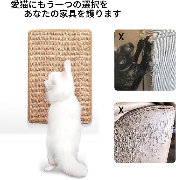 サイズと材質ーサイズ:40*60cm 材質:天然サイザル麻 この爪とぎマットに採用されているサイザル麻は丈夫であり、より長い時間爪とぎすることが出来ます。