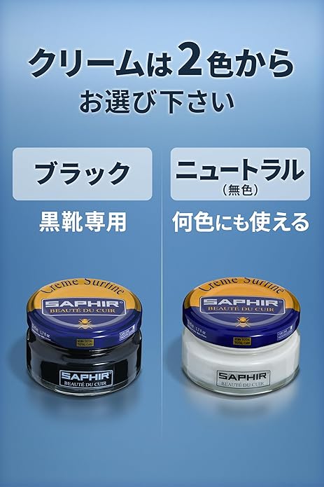 靴クリームは2色からお選びいただけます。黒い靴には”ブラック”を。”ニュートラル(無色)”は、全ての色の靴に使用できます。※ニュートラルは靴以外の革製品にも使用可能。