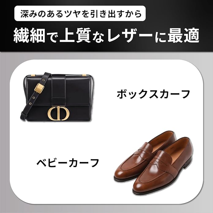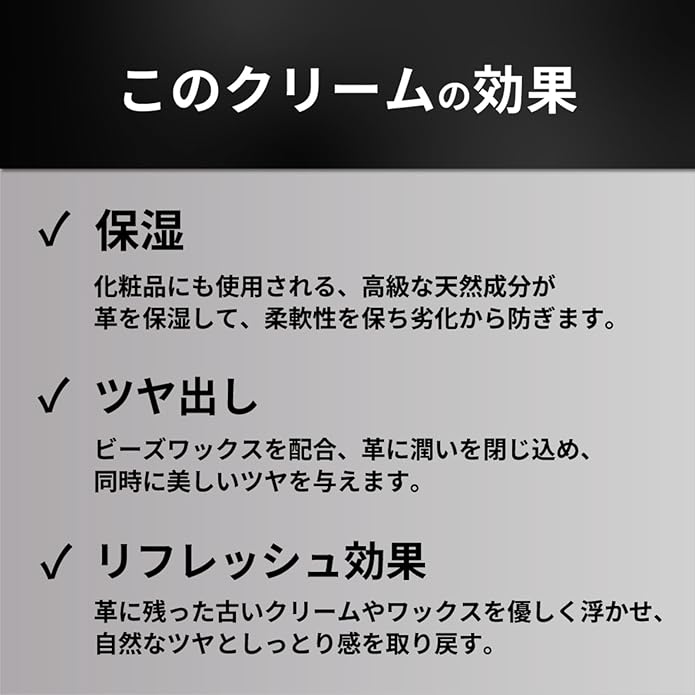 スムースレザー(表革)製品全般に、うるおいと自然なツヤを与えたい時に適したクリームです。