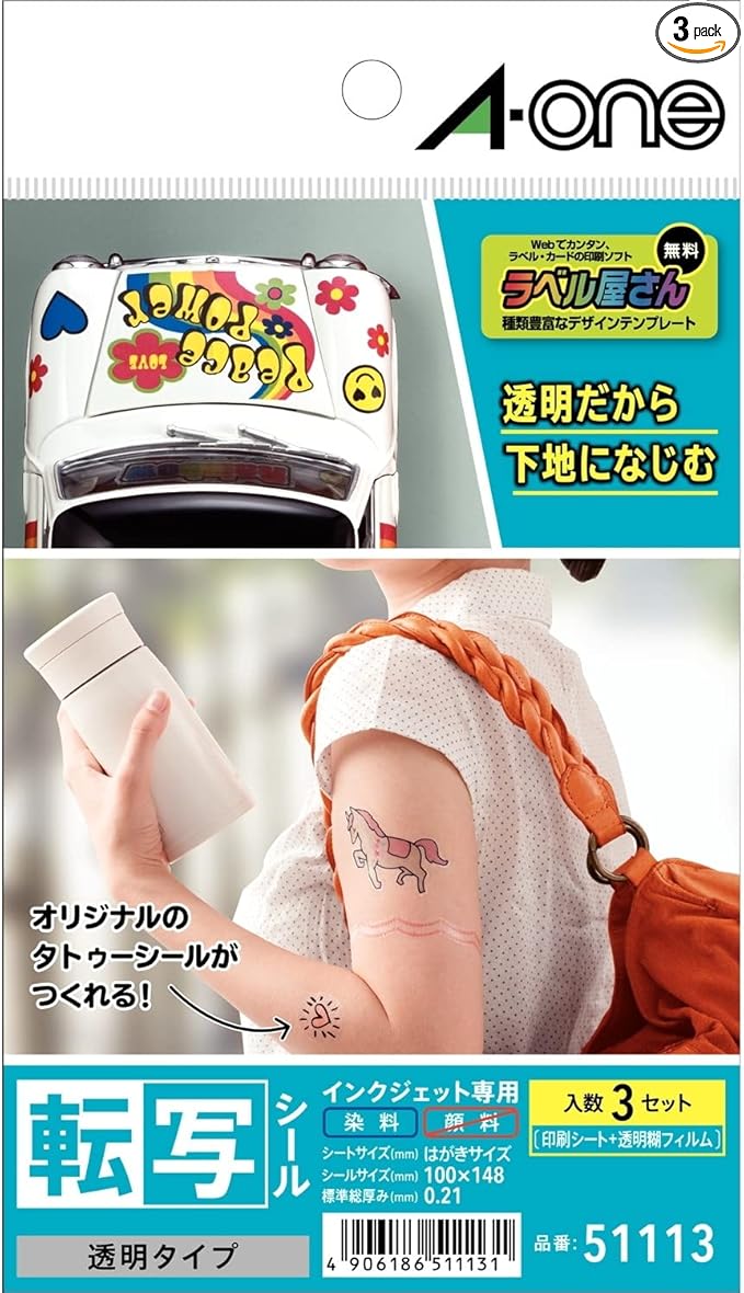 エーワン 転写 タトゥーシール 透明 はがきサイズ 3シート 51113