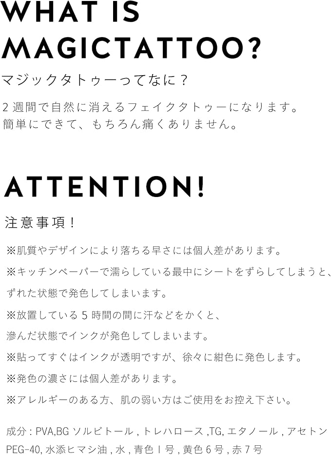 「MAG!C TATTOOとは?」 約2週間肌を染めるタトゥーシールです。 従来のタトゥーシールとは異なり肌の角質を染めるため、汗や水に強く剥がれる心配がありません。 【使用方法】1,はがす 透明なラミネートフィルムを剥がします。 (デザインが複数ある場合は切ってご使用することも可能です。) 2,しめらす 濡らしたテイッシュで10秒間押さえます。 3,はがす 白い紙をゆっくりと剥がします。 この時透明のツヤツヤしたインクが肌についていることを確認して下さい。 4,あとは待つだけ! インクをつけた状態で5時間ほどお待ちください。 シールを貼ってから24~48時間で程度で発色します。 約10日程度持続し、代謝に合わせて徐々に消えていきます。