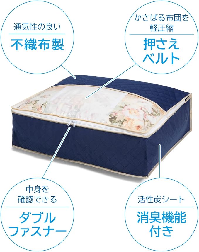 【商品仕様】:サイズ/約幅70 奥行55 高さ20cm、カラー/ネイビー、内容/1個、収納目安/ダブルサイズの羽毛布団1枚、材質/ポリプロピレン・活性炭・ポリエチレン