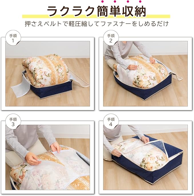 【羽毛布団のボリュームを優しく抑えて保管】:押さえベルト付きでかさばる羽毛布団の厚みを優しく抑え、スリムかつコンパクトに。圧縮しすぎないので羽毛を傷めにくく、ふかふか感や暖かさを次のシーズンまでキープ。