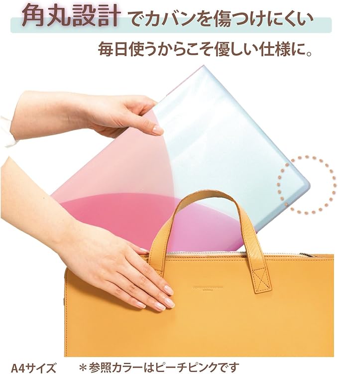 表紙に工夫:持ち運びやとりまとめに便利な外ポケット付。表表紙と裏表紙に合わせて3か所。角丸設計で周りを傷つけない配慮。