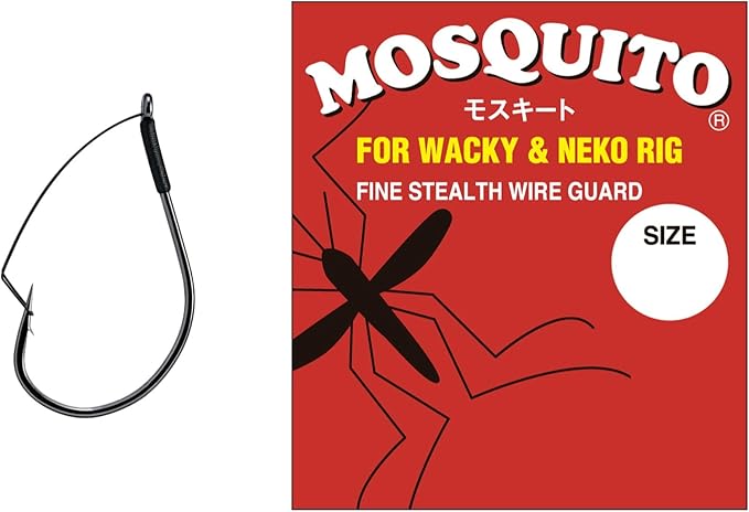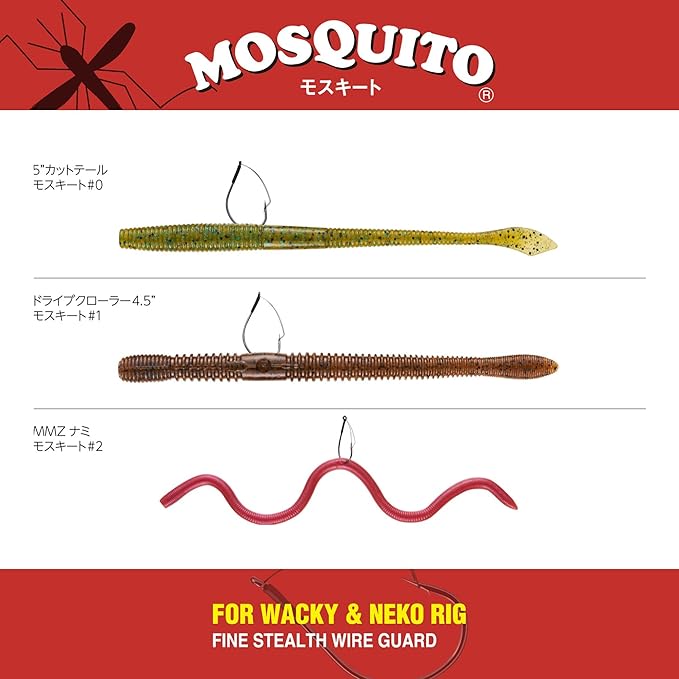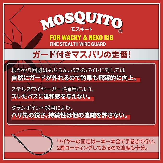 Nogales/ノガレスMOSQUITO/モスキート◆入り数:4本★超細軸タイプでワイヤーガード付きのワッキー・アンダーショットリグ専用フックです。ワイヤーの接着はスレッドで丹念に巻いてあるので強度も十分。ワイヤーガードもカモフラージュカラーのNSブラックを採用。完成度の高いワイヤーガード付フックです