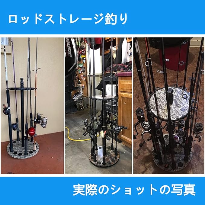 【超省スペース設計】従来の釣竿ホルダーに比べ、面積約0.09平方メートル(円径34cm)、高さ-73cmの最近人気の丸型ロッドホルダーです。 最大釣竿 収納数:釣り竿15本収納可能。 同時に、360 度回転可能なデザインにより、アクセスが容易になり、スペースを最大限に活用できます。