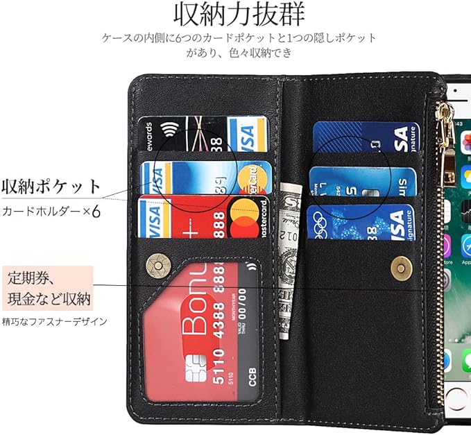 【財布機能】①6枚のカード、1枚の写真、1枚の紙幣のビット、カードや現金を安全に保管します。カード、建物、地下鉄またはその他の交通機関へのアクセスのために定期的にカードをスワイプする人に最適です、加えて精巧なファスナーデザイン :もっと安心してカードや現金を携帯のケースに入れて、安全で便利です。②精巧なファスナーデザイン :もっと安心してカードや現金を携帯のケースに入れて、安全で便利です。