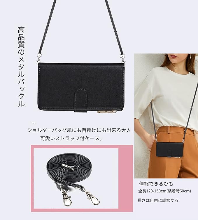 【クロスボディチェーン&リストストラップ】調節可能ショルダーストラップ長さ1.5メートル、可斜めがけ、可肩掛け。携帯電話が紛失する恐れはなし、ハンドバッグを持たずにどこでも旅行の贅沢さを満喫できます。ケースだけが必要な場合、ストラップは取り外し可能です。