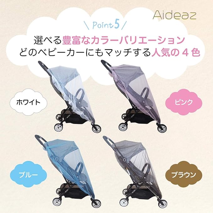 【カラーが選べて嬉しい、いつでも清潔で快適な空間に】お手持ちのアイテムに合わせて人気の4色からお色が選べるのでどのベビーカーにもマッチします。風で飛んできたゴミの侵入を防ぐ風よけネットとしても役立ちます。ネットの外側からはお子さんの様子がしっかり見えるので、お母さん、お父さんも安心。ネットの内側からの視界も良く閉鎖感が少ないので、お子さんもご機嫌です。手軽に洗濯ができて衛生的な点もポイント。*汚れが気になるときは、高音を避け、水もしくは、ぬるま湯で軽く”押し"洗いして下さい。洗濯機を使用する時は洗濯ネットを使用し、漂白剤は使わず、乾燥は自然乾燥させてください。