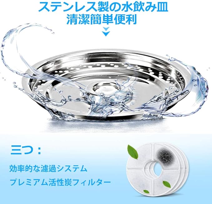 【ステンレス製の水飲み器-清潔簡単】普通の給水器水飲み皿所にはプラスチック類の素材を採用して、ペットの健康に不利と噛み壊しやすい。こちらの給水器は貯水池所にステンレス素材を採用して、無毒で無臭で環境にやさしい、ペットにも負担なし。給水器の組み立ても簡単で、ステンレス製の水飲み皿は清潔にもやすいです。