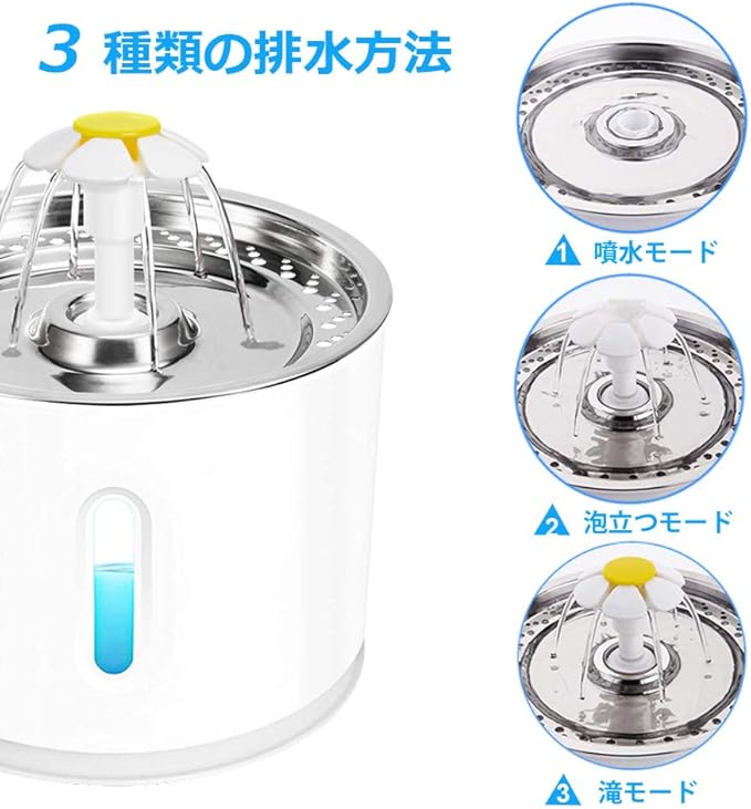 【3つモード水の流れ】ワンチャンとネコちゃんも流れ落ちる水を飲むのが大好きです。水の流れのモードは三つ:花の滝、花の泡と優しい噴水モード。 くぼんだシンクと水の循環システムを採用し、水と空気の接触面積と時間を増やし、より多くの酸素を水に溶け合いて、ペットに健康と活力をもたらすようにデザインされています。