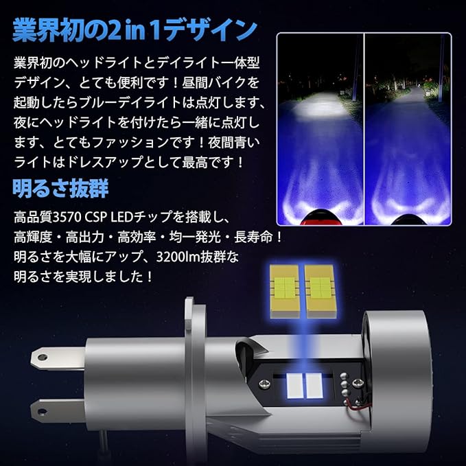 【業界初の2 in 1デザイン・無極性】業界初のヘッドライトとデイライト一体型デザイン、とても便利です!昼間バイクを起動したらデイライトは点灯します、夜にヘッドライトを付けたら一緒に点灯します、とてもファッションです!夜間青いエンジェルアイはドレスアップとして最高です!商品のサイズ:97*39mm。コンパクトでオールインワンのデザインで、追加のドライバーは必要なく、体積が小さくて、バルブの後ろ側のスペースが狭い車種でも取り付けられます。また無極性設計を採用して、極性を気にすることなく、すぐに取付けできる。