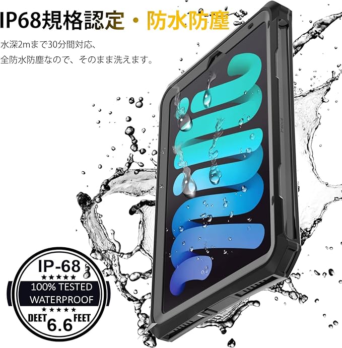【最高防水力】iPad mini 7/6 (8.3インチ 2024/2021)のみ対応。本ケースは端末を完全に覆い、密封する構造によって防水性を高めているため、IPコードによってIP68の最高防水等級をを取得しています。防水機能だけでなく、砂・ホコリ・ゴミなどの侵入も防ぎますので、お風呂や雨の日などの様々な場面でも活躍可能。