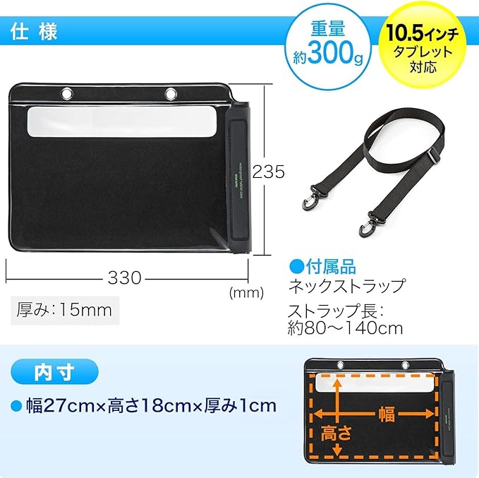 水や汚れを気にせず、10.5インチまでのタブレットPCが収納できる特殊加工のiPad・タブレット防水ケースです。