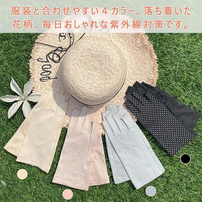 【UVカット】UV加工されたコットン生地を採用して、95%以上のUVカット率で紫外線から手元をしっかりガードするレディース手袋です。お出掛けや紫外線が強い時期はご使用いただけます。