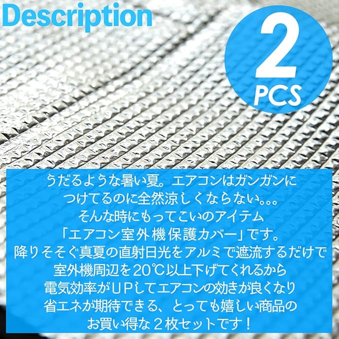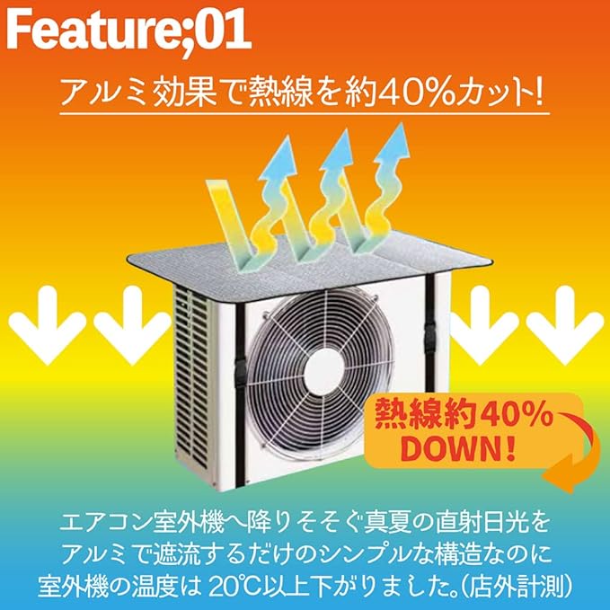 エアコン室外機へ降りそそぐ真夏の直射日光をアルミで遮流するだけのシンプルな構造なのに室外機の温度を20℃以上下げる効果があります。