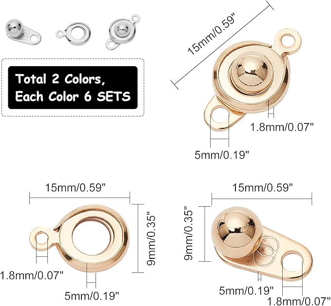 サイズ&入り数:スナップクラスプ:長さ:15mm、幅:9~10mm、5mm厚、穴径:1.5~1.8mm、2色、6個/毎色、12個入り;色:ステンレス色/ゴールデン;材質:304ステンレススチール;ハンドメイド作品への飾り付け、DIYなど様々な用途にお使いいただけます。