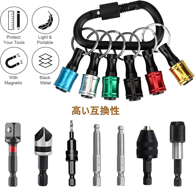 4.【便利なソケットホルダー】六角シャンク 類の持ち運びや保管に便利。ビットの種類を色分けで認識できます。大径フラットリングは、カラビナ等への装着がスムーズです。ダブルボールロックシステムでしっかりロック。スリムカラビナで腰につけても邪魔にならない。耐荷重:ビットホルダー1個当たり500g。