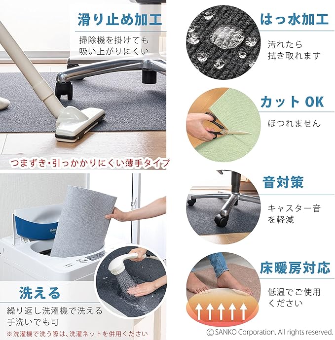 洗濯機OK(繰り返し使えます)、床暖房対応(推奨:低温)、ハサミでカット可能、日本製