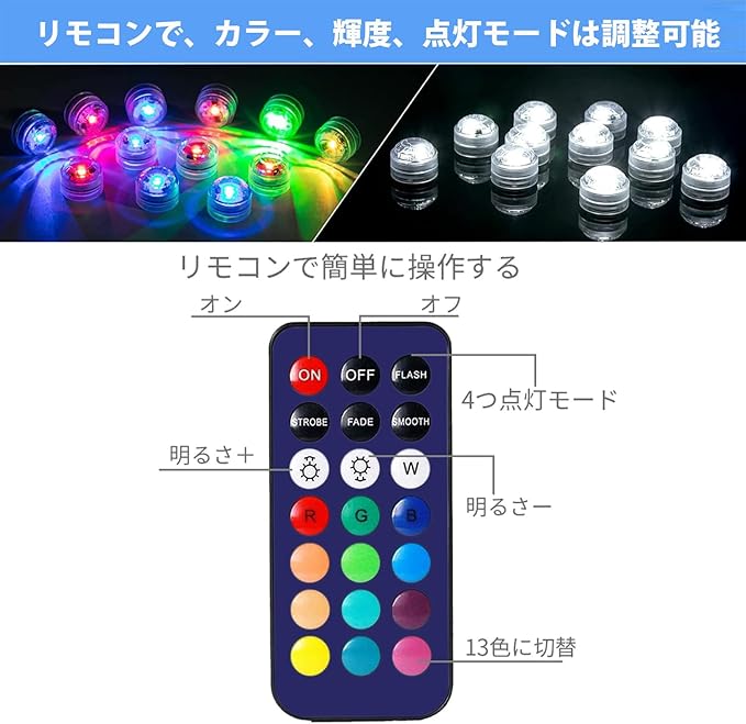ご注意:本製品は維凱電子だけ正規品です。リモコン操作:リモコンが付属するので、カラー、輝度、スピードなどは調整可能です。1ライトは1個超高輝度SMD5050 RGB LEDで作されて、全13色に切替え、水中に入れて非常に綺麗なマルチカラーのライトが輝いてます。