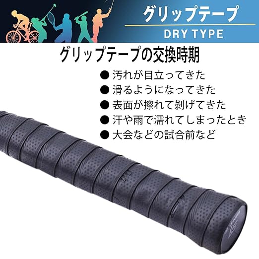 多用途に対応する優れた汎用性 このグリップテープは、テニス、バドミントン、スカッシュなどのラケットスポーツだけでなく、自転車のハンドルバーやバット、フィッシングロッドなどにも使用できます。優れたグリップ力と吸汗力を持つこのテープは、多様な用途に対応できるため、スポーツやレジャーのシーンで幅広く活躍します。