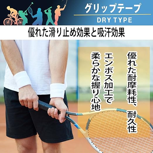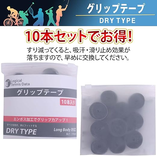 エンボス加工が施されたドライタイプのグリップテープは、テニスやバドミントンなどのラケットスポーツで最高のグリップ力を提供します。薄手でありながら抜群の吸汗力を持ち、無臭で常に清潔に保つことができます。大容量の10本セットでコストパフォーマンスに優れ、交換のタイミングも自由自在。