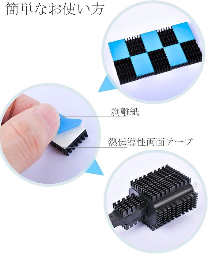 「簡単なお使い方」当ヒートシンクには、高質な放熱性高い両面テープも付属ので簡単に貼り付けできます。是非ご利用下さいませ!