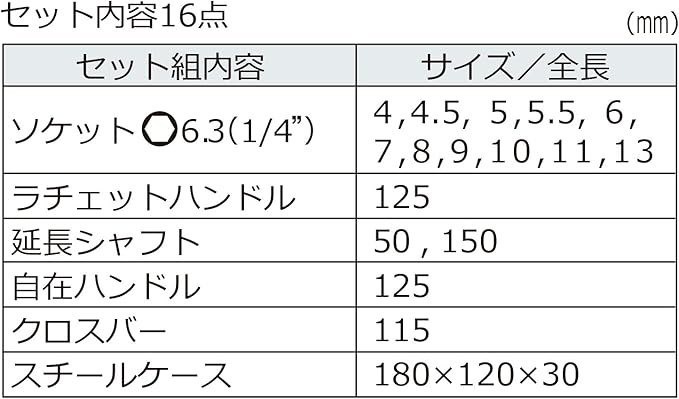 セット内容(サイズ):ソケット6.3mm(4mm、4.5mm、5mm、5.5mm、6mm、7mm、8mm、9mm、10mm、11mm、13mm)