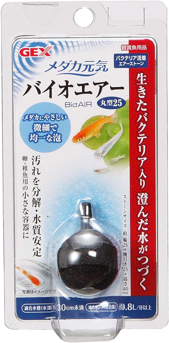 ・メダカ飼育用に開発された酸素と共に水を浄化するバクテリアを放出するエアーストーン。 ・メダカのフンや残餌など、水の汚れとなるゴミを分解する「汚れ分解バクテリア」を独自製法でエアーストーンに生きたまま休眠状態で封入。 ・「汚れ分解バクテリア」は酸素を使って活動するので、バクテリア付きエアーストーンにより、バクテリアと酸素の接触効率が上がって、より水をきれいにすることができます。 ・フィルターの補助、またフィルターを使用できない稚魚や卵の隔離容器、睡蓮鉢での飼育にも最適です。