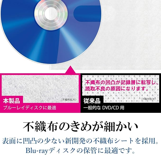 ■※ブルーレイディスクは他のディスクと比較し記録層をカバーしている層が薄いため、従来の不織布ケースに収納すると、不織布の凹凸が記録面へ転写され、読取不良の原因になります。