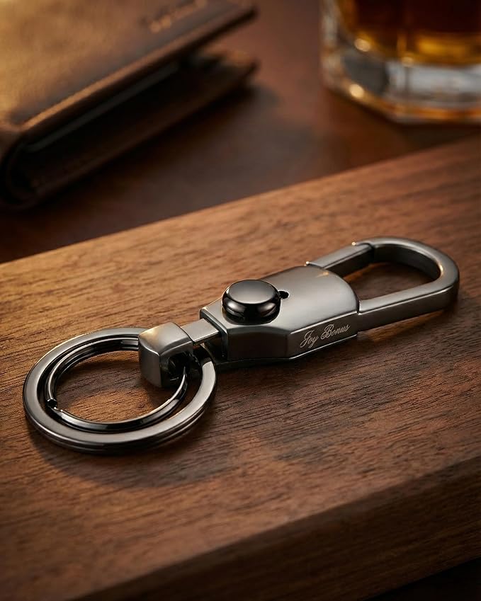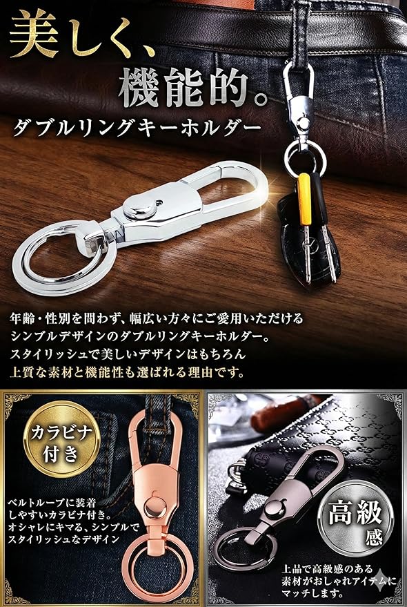 [Joy Bonus] ダブルリング カラビナ キーホルダー 車 バイク 自転車 ワンタッチ リング 取り外し シンプルデザイン メタリック ブラック
