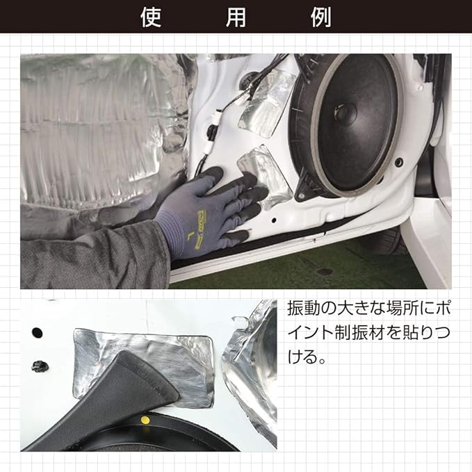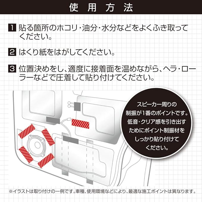 低音・クリア感を引き出すためにポイント制振材をしっかり貼り付けてください。