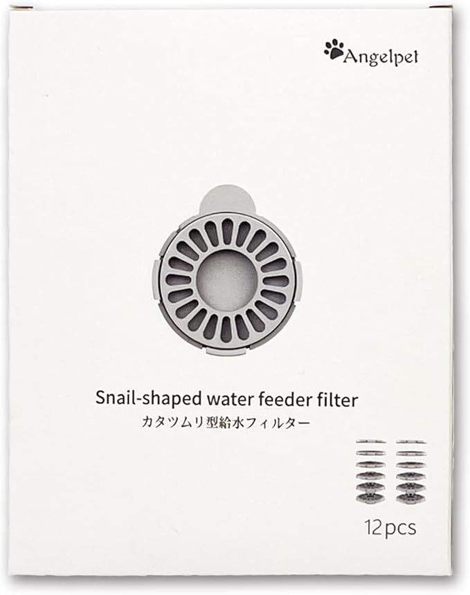 Angelpetカタツムリ形状のペット用自動給水器専用フィルターは、約1ヶ月ごとに交換が必要です。本セットが12枚入りますので、約一年間ご利用いただけます。