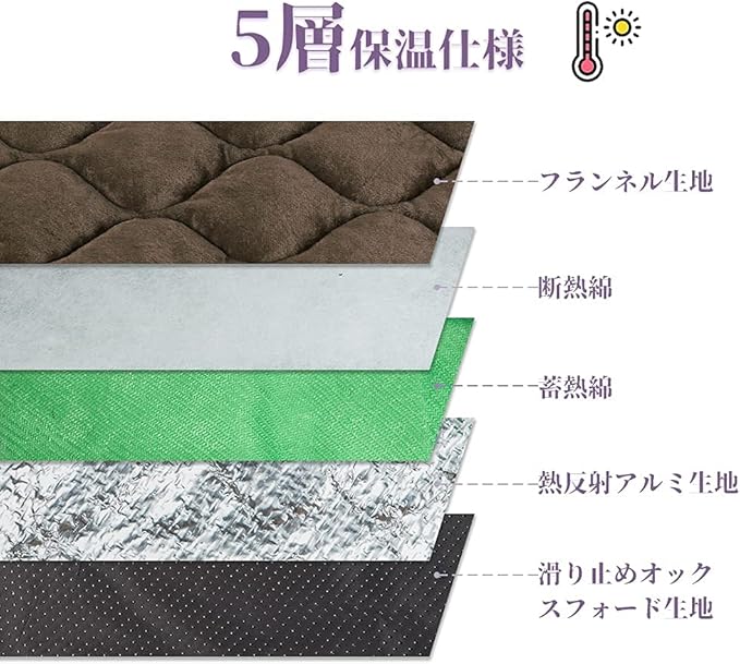 アルミや発泡ウレタンなどの断熱層で床から伝わる冷気をシャットアウトし、その上にある保温層でペットから伝わる体温を逃さずキャッチ。さらにアルミなどの反射層で温かさを反射させているので、しっかり保温できる仕組みになっています