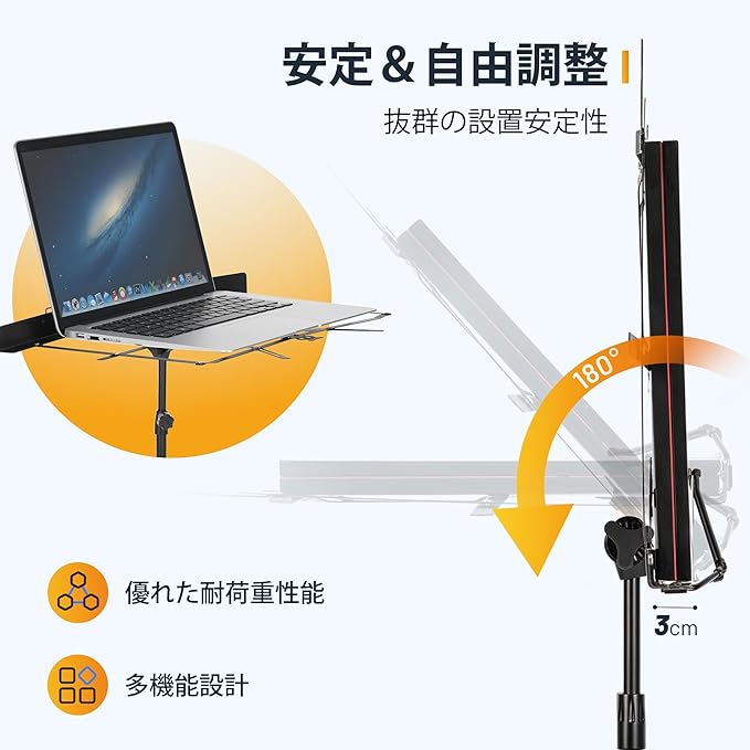 【使いやすい微調整用ノブ】ミュージックトレイは180度まで傾けることができ、どんな高さのユーザーでも楽譜を読めます。また、最高荷重は5kg、譜面板寸法は50.5cm*29cmなので、楽譜だけではなく譜面板上はノートPCもプレゼン資料も本も置けます。プロジェクターの台としても使えます。