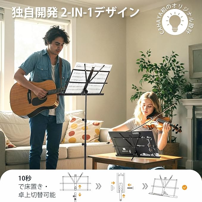 【二つの功能】譜面台としても、デスクトップスタンドとしても使えます。