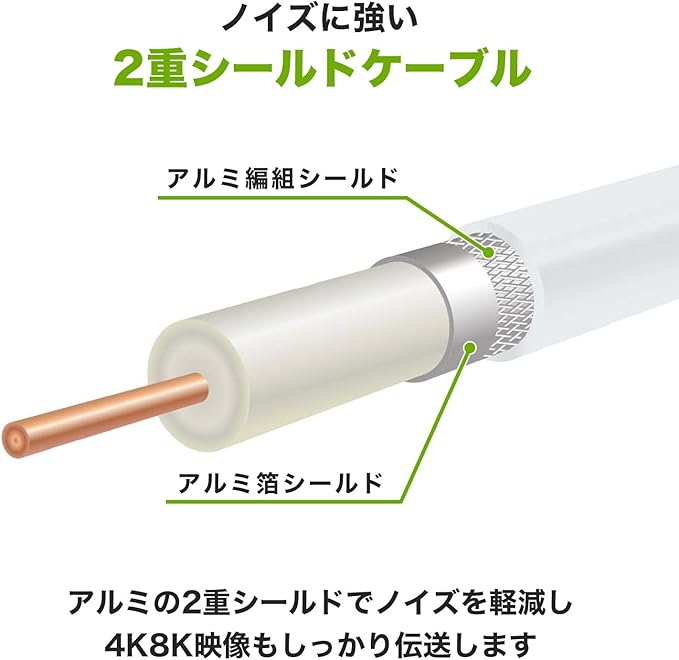 ●新4K/8K衛星放送対応●▼従来の地デジ、BS、CS放送に加えて、最新の4K/8K放送にも対応しています。●しっかり接続できる安心のネジ式コネクタ●▼コネクタはネジ式ですのでしっかりと機器に接続でき、抜け落ちる心配がありません。●優れたデザイン性●▼洗練されたアルミヘッドで飽きのこないデザイン。●豊富なバリエーションでシチュエーションに沿ったケーブルをお選びいただけます。●信号の劣化しにくいS-4C-FB規格同軸ケーブルを採用●両端子金メッキ仕様